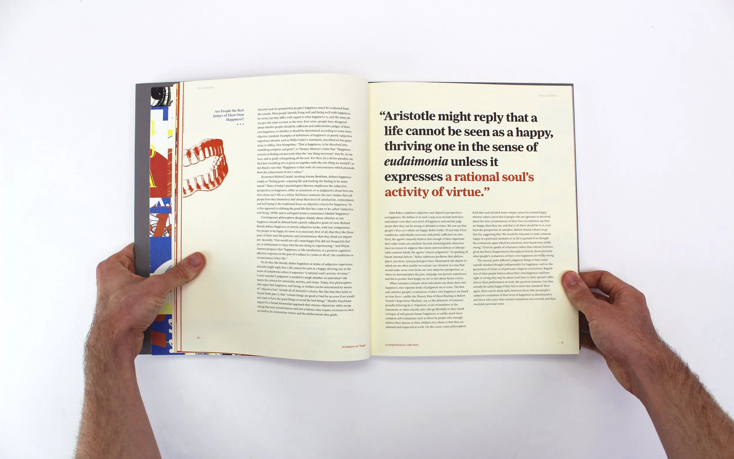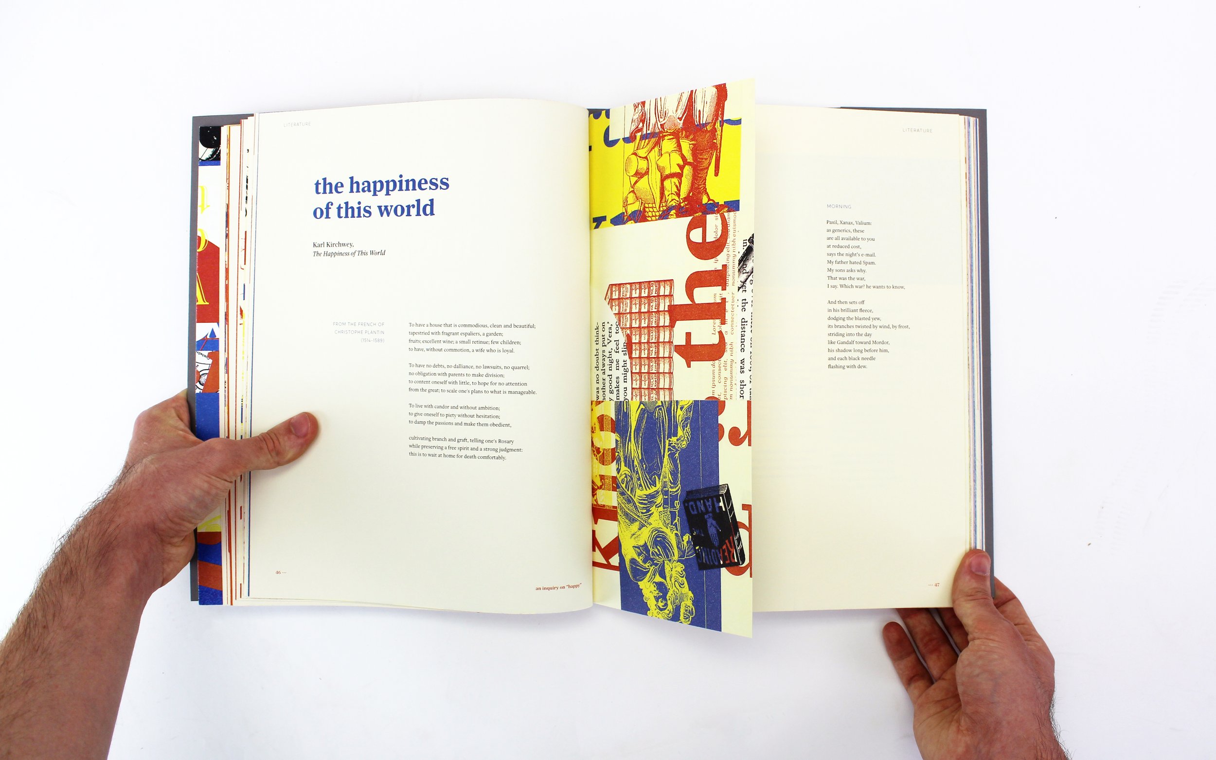 Collage and vellum inserts give the book a dynamic feel while also signifying the different representations that happiness can take; whether they are quiet, overwhelming, subtle, or almost hidden.